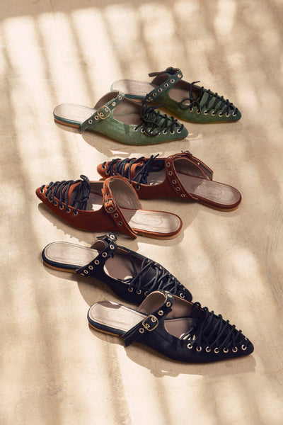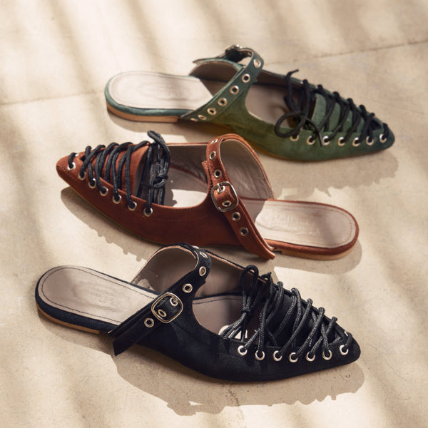 Step out with confidence in Urban Muse, a bold pointed-toe flat crafted in rich black suede. Featuring a lace-up front, metallic eyelets, and an adjustable ankle strap, this design blends edgy details with refined elegance. Lightweight, sleek, and effortlessly stylish.